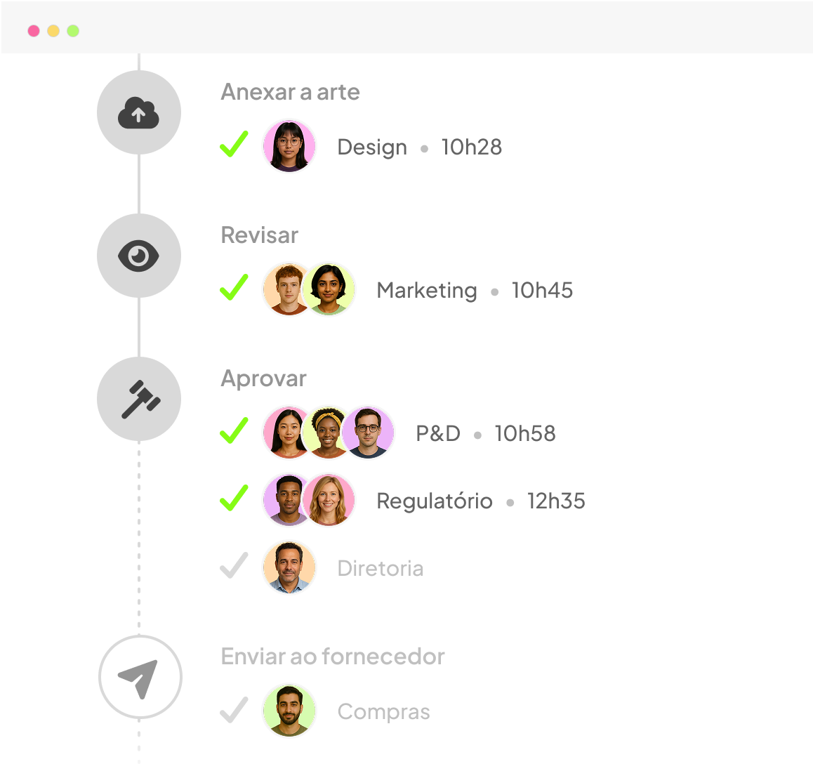 As áreas podem revisar artes simultaneamente ou em sequência, sem travar o processo nem gerar gargalos.